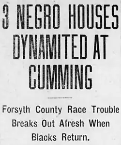 - ^ "Terror in Cumming; Race Riot Feared". The Atlanta Georgian. September 11, 1912. p. 1. Retrieved March 5, 2023 – via newspapers.com.