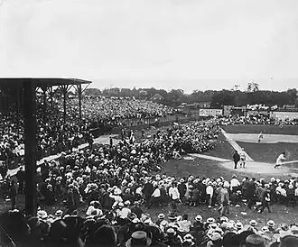 By 1912, fan conduct in major league ballparks had become a matter of public discussion. Despite efforts to provide a family-friendly atmosphere, it was common for some of those attending to spend time hurling bottles and epithets at those on the field. Players sometimes responded verbally, or even physically—Cy Young, who had a reputation as mild-mannered, had gone into the stands to confront a heckler.[2] There were no security guards or ushers at the time, and the police could be as partial as the fans.[3]