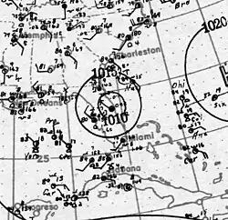 The first storm of the season developed quickly, beginning as a tropical storm early on July 31 about 70 mi (115 km) northeast of the Abaco Islands in the Bahamas. The storm reached hurricane intensity the following day as it approached Florida.[3] At 18:00 UTC on August 1, the small hurricane made landfall near Titusville, Florida, at peak strength with winds of 75 mph (120 km/h) and a minimum atmospheric pressure of 990 mbar (29 inHg).[2] It then weakened and curved towards the northeast, taking a track across the Appalachian Mountains as a tropical storm.[3] Slight reintensification occurred as it approached the Mid-Atlantic states, perhaps aided by baroclinic influences. Late on August 4, the system became extratropical upon merging with a frontal boundary,[2] and later dissipated the following day.[3]