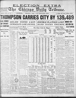 Thompson defeated Sweitzer by greater than an 11% margin.[20] In terms of the number of votes, Thompson's margin of victory was greater than any prior Chicago municipal election.[9][21] The number of votes Thompson received was more than any other candidate for mayor of Chicago had received, up to that time.[6] Thompson won 25 of the city's 35 wards.[9] Thompson's victory had coattail effect on coinciding municipal races.[21]