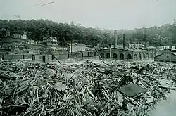Charlotte, North Carolina, recorded 5.04 in (128 mm) of rain in 24 hours, setting an all-time 24-hour rainfall record.[32] Gusty winds and heavy rain began to affect the city on July 13, with gusts above 50 mph (80 km/h) damaging storefronts, uprooting trees, and tearing away awnings and signage. The rain continued for two more days, causing a flood that inundated homes and stores. However, it was surge of water from the excessive rains upstream along the Catawba River that ultimately brought the greatest impacts to the Charlotte area.[33] The Catawba River crested at a record 45.5 ft (13.9 m), some 22.5 ft (6.9 m) above the previous record set in 1908; the 1908 flood had previously been considered the most severe flood in the South Atlantic states. The margin between the water levels reached in 1916 compared to the previous 1908 record diminished downstream but remained record-setting. The high volume of water caused the river to expand; following the 1916 flood, the Catawba River would be 50 ft (15 m) wider at moderate stage than prior to the flood.[31] The floods destroyed bridges, mills, crops, railways, and roads; the flooding of roads disrupted traffic for several weeks.[3] Farms in Burke, Caldwell, Catawba, and McDowell counties were swept bare. Hydroelectric power plants and concrete dams along the river sustained thousands of dollars in damage. While most cotton mills remained standing, they were nonetheless ruined by intruding floodwaters; the destruction of cotton warehouses cemented the significant blow to the cotton industry.[33] Railroads sustained particularly heavy losses due to the floods.[30] Near Mount Holly, thousands of people gathered on two railway bridges to observe the river's rise. These bridges later succumbed to the force of the floodwaters, forcing the onlookers to flee to safety. All bridges along the Southern Railway between Statesville, North Carolina, and Asheville collapsed, which in addition to numerous washouts left passengers marooned for days. Eighteen people were killed in Mayesworth, North Carolina, after a Southern Railway bridge collapsed.[33]
