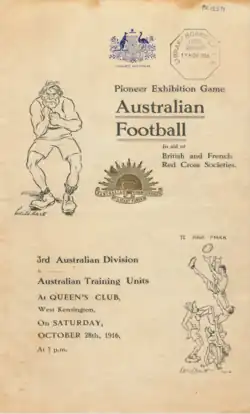 - An Australian football match (an Australian Division v. Training Groups) will be played at Queen's Club, West Kensington, tomorrow, at 3 p.m., in aid of the British and French Red Cross Funds. The game, played by 18 players a side, will show how Australians have combined "Soccer" and Rugby. — The Times, Friday, 27 October 1916.[29]