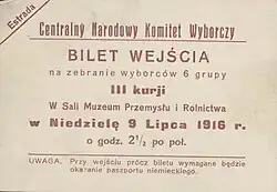 Whilst there were attempts to agree on compromise candidate lists for the Third Curia, eventually competing candidacies emerged in some groups within the curia.[21] The voting for the elections in the Third Curia was held July 10-12, 1916 at the City Hall (Jabłonowski Palace).[21][22]