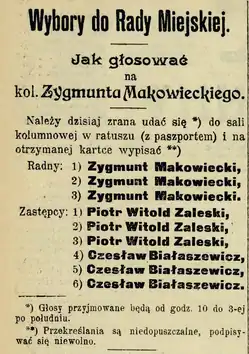 - ^ Przed wyborami do rady miejskiej in Kurjer Warszawski, June 6, 1916. p. 4