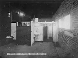 Men were separated from women and children into separate buildings, where they were stripped of all clothing and valuables. Most clothing and valuables were steamed. Other items which might be damaged by steam (like shoes, hats, or belts) were exposed to cyanogen gas. Attendants examined the nude people for lice.[11] The officers conducting the strip searches were rumored to have photographed the nude women and shared the photos to others at bars.[13] When lice were found on a man, the man's hair was clipped close to his head and the clippings were burned. For a woman, the hair was doused in a mixture of vinegar and kerosene, wrapped in a towel, and left on the hair for at least 30 minutes. If lice were found on re-inspection, the process was repeated. Once attendants declared the lice test had been "passed", the naked people were gathered in a bathing area and sprayed with a liquid soap made of soap chips and kerosene oil.[11] After collecting their sanitized clothing and dressing, migrants were evaluated by a foreman, vaccinated and given a certificate that they had completed the procedure. From the disinfecting area, migrants then entered the Immigration and Naturalization Service building for processing.[14]