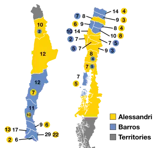 Presidential election results map. Yellow denotes states won by Alessandri and blue denotes states won by Barros. Numbers indicate the number of electoral votes cast by each province.