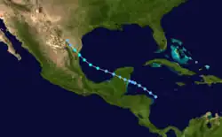 The hurricane weakened slightly prior to making landfall near Playa del Carmen, Quintana Roo, with winds of 100 mph (160 km/h) around 12:00 UTC on October 18. Crossing the Yucatán Peninsula, the cyclone weakened to a tropical storm by 00:00 UTC the next day. Early on October 20, the storm emerged into the Bay of Campeche and quickly re-strengthened into a hurricane. The system then drifted slowly south-southwestward. Shortly after 18:00 UTC on October 21, the hurricane made landfall near Paraíso, Tabasco, with winds of 80 mph (130 km/h). The storm rapidly weakened after moving inland and dissipated near Cárdenas by 06:00 UTC the next day.[6]