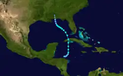 A low-pressure area previously associated with a frontal boundary developed into a tropical depression just north of Honduras on October 12.[3] Initially moving northeastward, the depression intensified into a tropical storm around 12:00 UTC on October 13 and then began heading northward. Around 06:00 UTC on October 14, the storm made landfall on Isla de la Juventud, Cuba, with winds of 40 mph (64 km/h), shortly before striking modern-day Artemisa Province at the same intensity. After emerging into the Gulf of Mexico, the storm intensified further, peaking with winds of 50 mph (80 km/h) early on October 15. The cyclone then decelerated and weakened, falling to tropical depression status by late the following day.[6] Around 09:00 UTC on October 17,[3] it made landfall near Orange Beach, Alabama, with winds of 30 mph (48 km/h).[6] The storm quickly lost tropical characteristics and was absorbed by a frontal boundary several hours later. It may have been a subtropical storm due to some hybrid characteristics. The system left minimal impact in Cuba and the Gulf Coast of the United States.[3]