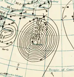 A northeast-southwest oriented trough developed into a tropical depression about 870 mi (1,400 km) east-southeast of Barbados early on September 13.[3] Initially moving west-northwestward, the depression intensified into a tropical storm several hours later, before curving northwestward the next day.[6] The French S. S. Mont Rose was the first ship to encounter the storm, then centered about 200 mi (320 km) east of Martinique on September 15.[3] Thereafter, the cyclone strengthened significantly, becoming a hurricane around 12:00 UTC and then reaching major hurricane intensity by 06:00 UTC on September 16.[6] The cyclone strengthened slightly over the next few days, with sustained winds peaking at 120 mph (190 km/h) on September 17. By later that day, the system curved northward while centered north of the Mona Passage. Early on September 20, the hurricane began moving north-northeastward.[6] Around 12:00 UTC on September 21, the hurricane passed almost directly over Bermuda while still at major hurricane intensity.[6] The storm began accelerating and weakening later on September 21. By 00:00 UTC on September 23, the system became extratropical about 510 mi (820 km) south of Cape Race, Newfoundland. The remnants slowly weakened while approaching the British Isles, before dissipating over the English Channel on September 28.[6]