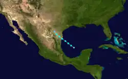 The third storm of the season was first identified as tropical depression off the northwestern coast of the Yucatan Peninsula early on September 6. The system moved at a steady pace to the northwest towards the Rio Grande Valley. Shortly after forming, the depression strengthened into a tropical storm.[6] At this time, a ship in the vicinity of the storm recorded a pressure of 1012 mbar (hPa).[9] By 1800 UTC that day, the storm reached its peak intensity with winds of 50 mph (80 km/h).[6] Around 9 pm CST (0300 UTC on September 7) that night, storm warnings were issued for areas between Brownsville and Corpus Christi, Texas. These warnings were later expanded to include the entire Texas coastline.[2]