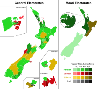 The result was a landslide victory for the Reform Party. A total number of 678,877 (90.02%) voters turned out to vote. In one seat (Bay of Plenty) there was only one candidate.[1][2]