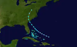 At approximately 12:00 UTC on September 30,[5] a low pressure area developed into a tropical depression while situated about 175 mi (280 km) northeast of Turks and Caicos Islands.[4] The depression moved parallel to the islands of the Bahamas and slowly strengthened, reaching tropical storm status early on October 2.[5] Continuing its northwestward motion, the storm strengthened further and peaked early on October 3 with maximum sustained winds of 60 mph (95 km/h) and a minimum barometric pressure of 1,008 mbar (29.8 inHg),[5] the latter of which was a ship observation.[4] Around 09:00 UTC, the cyclone made landfall near Beaufort, South Carolina, at the same intensity. The storm curved northward after moving inland and weakened to a tropical depression early on October 4. Several hours later, the system dissipated over West Virginia.[5]