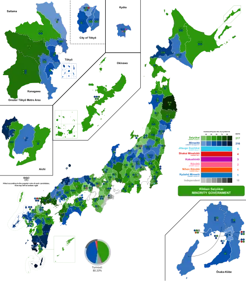 General elections were held in Japan on 20 February 1928,[1][2] the first after the passing of the Universal Manhood Suffrage Law in 1925 which introduced universal male suffrage for men 25 years and over.[3] The ruling Rikken Seiyūkai led by Prime Minister Tanaka Giichi won one more seat than the opposition Constitutional Democratic Party led by Hamaguchi Osachi, although the Constitutional Democratic Party had received slightly more votes. The hung parliament led to the Tanaka government continuing in office.