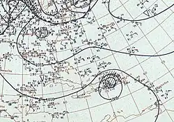 The hurricane moved directly over the Leeward Islands in the Caribbean Sea, strengthening as it did so.[4] On the island of Dominica, winds were clocked at 40 mph (64 km/h).[15] One person perished, while the cyclone also damaged seawalls and ruined crops.[9] In Martinique, further south of the storm's path, there were three deaths.[9] Waves washed away homes along the island's northwest coast, although a report by Walter S. Reineck, U.S. Consul in Martinique, noted that the worst damage occurred to cocoa, lime, and sugarcane crops.[16]