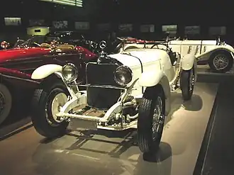 The first German car to run at Le Mans was a privateer entry. Mercedes and Benz had merged in 1926 and had considerable racing success, but with the Depression the company closed its works racing team. Team manager Alfred Neubauer, however, convinced the board to bankroll a privateer team. This was run by their top works driver Rudolf “Rudi” Caracciola. The SSK (Super Sports Kurz) was designed by Ferdinand Porsche as a development of the SS model. The giant 170 bhp 7.1-litre engine could be augmented by a Roots supercharger to put out 300 bhp.[8] However, unlike the Bentleys, the supercharger was not designed to be run all the time (not least for reasons of chronic fuel consumption), and the team was able to convince the ACO to discount the 1.3 supercharger modifier when dictating the car's target distance.[8] Caracciola's co-driver was also from the Mercedes-Benz works team, Christian Werner.