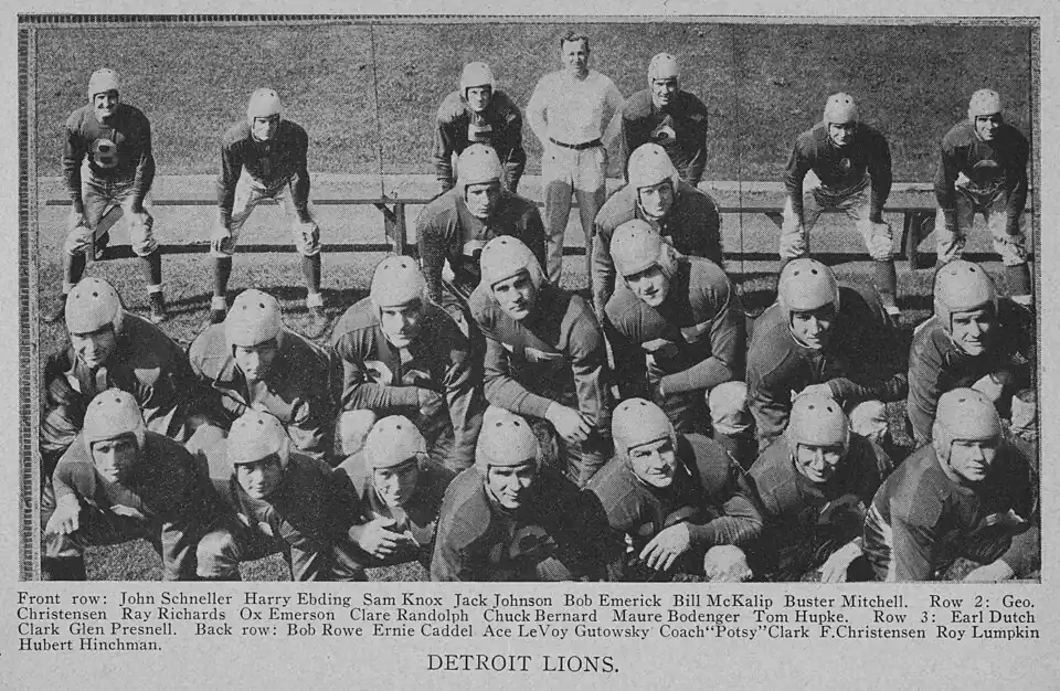 The Lions' starting lineup in their first game in Detroit was as follows: Harry Ebding (right end), George Christensen (right tackle), Ox Emerson (right guard), Chuck Bernard (center), Maury Bodenger (left guard), Jack Johnson (left tackle), Bill McKalip (left end), Dutch Clark (quarterback), Ernie Caddell (right halfback), Father Lumpkin (left halfback), and Ace Gutowsky (fullback). Detroit substitutes who appeared in the game were backs Frank Christensen, Glenn Presnell, and Bob Rowe, ends Buster Mitchell and John Schneller, and tackles Sam Knox and Bob Emerick.[6]