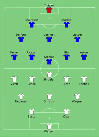 France took the lead with a goal from Jean Nicolas, who had suffered a head injury in the early stages of the match. Austria drew level on the brink of half time thanks to a goal from the star Matthias Sindelar. An uneventful second half followed, so the match became the first in the history of World Cup to go to extra time. In the extra time, Austria prevailed and scored twice before France got a late second goal from the spot.[2]
