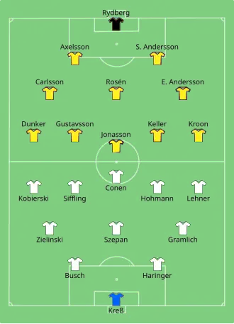 Pouring rain influenced the match, which saw very few notable moments in the first half. In the second half, Ernst Andersson suffered a head injury, and Germany took the lead with Karl Hohmann while the Swedish player was off. Hohmann scored again three minutes later. Sweden managed to get a goal back, but their subsequent efforts were not enough and Germany progressed to the first of many semi-finals.[2]