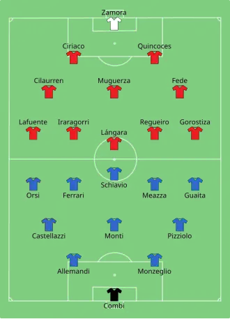 The first game between Italy and Spain was one of the most contentious and marred by several poor refereeing decisions, especially seeing Italy players challenging roughly the goalkeeper Ricardo Zamora. Spain went ahead with Luis Regueiro, but their lead did not last long. Italy equalized when Giovanni Ferrari knocked in a rebound, while Zamora was blocked off by Schiavio. The tie required a replay to settle.[2]