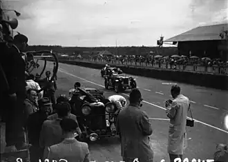 The race was winding down to a predictable finish, when Fontés pitted at 3pm, off-schedule. At the previous pit-stop, the car had not had its oil topped up. The Lagonda had a two-lap lead but had dangerously low oil pressure. Rules stipulated it was not allowed to be replenished outside the standard pit-windows, so with less than an hour to go, he gingerly left for another lap.[31][27][4] He came back with the car running worse, but the pit-crew exhorted him to carry on, albeit cautiously. Louis-Dreyfus was driving hard, and with 20 minutes to go, the public-address loudspeaker reported he was closing in quickly on the Lagonda for the lead. The next lap he overtook Fontés and his pit-team signalled him to ease off, believing him to now be leading. However, at 3.55, the announcer admitted the mistake that the Alfa was, in fact, still 3 minutes behind on the same lap.[8][31][4][29] By then it was too late to catch the ailing Lagonda and it came home for the first British win since Bentley at the start of the decade.[33]
