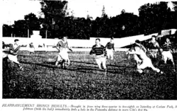 At the board of control meeting on May 1 after the consideration of reports it was “decided to advise senior clubs that the new play the ball and hooking rules would be more rigidly enforced from next Saturday”. Players would be given the opportunity to “brush up” on the rules by attending referee demonstrations on Tuesday and Thursday evenings. It was scheduled that all coaches and team captains would meet on April 24 at a Referees Association conference to discuss the new amendments to the playing rules.[16] The play the ball rule stated that “players playing the ball must keep both feet on the ground until the ball has been placed thereon and the players acting as respective halfbacks must stand one yard behind the player playing the ball. All other players must not approach within three yards and be behind the acting halfbacks”. In addition to this the “offside rule of five yards radius within which players are offside is now increased to 10 yards”. While a drop out from touch now necessitated that “the attacking player must stand five yards away from the goal line, and when the game is restarted the ball must be kicked from behind the goal posts, and must reach this five yard mark. Formerly the attacking player stood on the goal line”.[17]