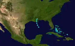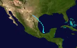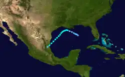 An area of disturbed weather persisted across the northwestern Caribbean Sea in early October. It tracked northwestward over the Yucatán Peninsula, and subsequent to the development of a low-level circulation the system organized into a tropical storm on October 9 while located about 60 mi (95 km) northwest of the capital of Campeche. After moving northward, the storm turned sharply southward, and made landfall in northern Tabasco as a minimal tropical storm on October 10. The system quickly weakened over land, and dissipated over Chiapas on October 11.[9] The system dropped heavy rainfall across southeastern Mexico, though damage, if any, is unknown.[1]