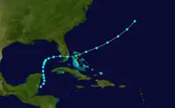 On June 9, a tropical cyclone with atmospheric pressure below 988 mb (29.18 inHg) made landfall on the Pacific coast of Guatemala.[4] It moved northeastward across Central America, but dissipated before reaching the western Caribbean Sea on June 12. The storm quickly re-organized, and again developed into a tropical storm on June 12. It moved north-northeastward, resulting in light winds as it paralleled the eastern coasts of Belize and the Yucatán Peninsula. After reaching the Gulf of Mexico with peak winds of 45 mph (75 km/h), the storm turned to the northeast, then to the east. On June 15, the tropical storm made landfall about 20 mi (32 km) to the south of Fort Myers, Florida, and after crossing the state it passed over Miami before entering the Atlantic Ocean.[4] It weakened as it accelerated northeastward through the Bahamas, and on June 17 the system dissipated to the north of Bermuda.[1]