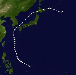 On September 22, a depression formed between Luzon and Guam. For the next four days, the system meandered without much development, eventually taking a northwest path on September 27 toward the Ryukyu Islands. On October 1, the typhoon slowed and made its closest approach to Okinawa, where a pressure of 982 mbar (29.005 inHg) was recorded in Okinawa. The typhoon turned northeastward and brushed the coast of southern Honshu, passing south of Tokyo on October 3. The system was last observed on October 5 near the Kuril Islands.[26] Across Japan, the typhoon killed 70 people, including 60 fatalities related to the sinking of the Kashima Maru. The typhoon also flooded about 4,000 houses.[27]