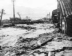 The 1938 Hanshin flood (Japanese: 阪神大水害[1][2]) was caused by heavy rains, which resulted in landslides and floods in the Mount Rokkō area, Hyōgo Prefecture in Japan in July 1938.[3][4][5] According to the official government report, torrential rains resulted in flash floods and debris flows that affected the Mount Rokko area, including Kobe and Nishinomiya. At least 715 people lost their lives.[6] The floods feature in Junichirō Tanizaki's novel The Makioka Sisters.