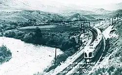 The City of San Francisco was a cross-country passenger train running from Oakland, California to Chicago, Illinois. The train was jointly operated by three railroad companies, and the Nevada portion was operated by the Southern Pacific Railroad (SP).[2] The incident happened approximately 1.5 miles (2.4 km) east of Harney, a named rail siding along the SP main line as it follows the Humboldt River through Palisade Canyon, between the towns of Beowawe and Palisade.[3] The train derailed at a high embankment next to a bridge over the river along a curve in the canyon. Sometime later, the Humboldt River was re-channeled and the tracks adjusted at this curve. There is no bridge at the location of the derailment today.[4]