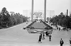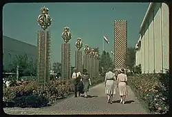 The fairground contained one million plants, one million bulbs, 250,000 shrubs, and 10,000 trees.[141] The site had 7,000 American camassias, 48,000 scillas, and 50,000 narcissi, and there were several formal gardens as well, with roses, yew, and other plants.[271] In addition, the Netherlands donated one million tulip bulbs;[272][273] as part of an agreement with the Dutch government, the tulips were destroyed and replaced with summertime plantings the month after the 1939 season opened.[274] The Washington Post estimated that the WFC spent some $150,000 (equivalent to $3,391,000 in 2024) on plants at the fair.[273] There were also around 50 landscaped gardens.[275] Some of these fountains included water features such as fountains, pools, and brooks.[276] For the 1940 season, annuals and trees were added instead of the tulips,[277] and a woodland garden was added.[278]