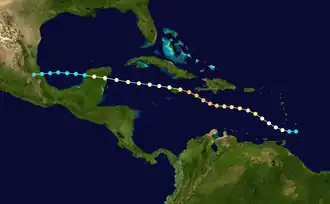 At around 16:00 UTC on August 20, the hurricane made landfall in the vicinity of Boston Bay along the coast of Jamaica with winds of 120 mph (195 km/h). At landfall, the hurricane's eye spanned 5 mi (8.0 km) across, resulting in a 15–20 minute lull in winds over eastern portions of Jamaica as the eye passed overhead.[2] The storm traversed the island over several hours, emerging near Montego Bay by 23:00 UTC that day as a weakened system equivalent to a Category 1 hurricane.[2][3] The storm largely maintained its strength in the western Caribbean Sea, passing near Grand Cayman on August 21 with the same intensity with which it departed from Jamaica.[1][3] The following morning, the hurricane struck the Yucatán Peninsula near Cozumel Island and degenerated into a tropical storm over the peninsula. Despite reemerging over the Bay of Campeche, weakening continued; the system ultimately moved ashore near Tuxpan, Mexico as a minimal tropical storm early on August 24 before dissipating inland later that day.[2]