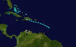 Around 00:00 UTC on August 2, the third tropical cyclone of the season formed about 85 mi (137 km) northeast of Barbados. It crossed Dominica into the Caribbean Sea, where the storm attained peak winds of 60 mph (97 km/h) and prompted small craft advisories.[2][12] Missing Puerto Rico to the south, the cyclone then moved ashore west of Santo Domingo in the Dominican Republic at peak strength early on August 4.[3] It dissipated over the island later that day and produced only scattered thundershowers across the region,[2][13] including up to 9.7 in (246 mm) of rainfall on Montserrat in a 24-hour period.[14]