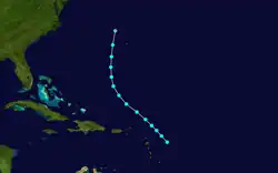 Another short-lived tropical storm was first identified about 195 mi (314 km) east of Guadeloupe by 12:00 UTC on September 9. Data from a reconnaissance aircraft indicated the storm intensified slightly to attain winds of 60 mph (97 km/h) by early the next day,[2] in spite of a poorly defined circulation center.[3] It tracked northwest and then north, passing within 130 mi (210 km) of Bermuda before dissipating around 18:00 UTC on September 12.[2]