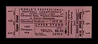 Upper deck ticket for the 1945 "World's Professional Football Championship" game held in Cleveland. Printed ahead of the game, these tickets included neither the date or the name of the Eastern Conference opponent.