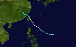 Typhoon Queenie was a storm that formed over the northeastern part of the Philippines on August 5, 1945, and dissipated on August 9, 1945. It had 1-minute sustained winds of 140 km/h (90 mph) and a pressure reading of 976 mb. Queenie formed close to the Philippines and made its way over the northern part, eventually making its way back to the sea where is later dissipated. Damages and fatalities are unknown.