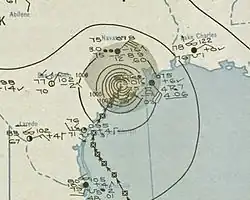 The hurricane executed a slight curve to the northeast later that day, causing it to move inland over the Texas coast.[3] Initially, the major hurricane was analyzed to have made landfall early on August 27 over Port Aransas with winds of 140 mph (225 km/h), equivalent to a modern-day Category 4 hurricane.[2][3] However, a reanalysis was conducted on the system, and concluded that it had only attained Category 3 intensity before making landfall at 1200 UTC that day. The reanalysis moved the landfall point closer to Seadrift as well.[3] At the time, the storm had maximum sustained winds confined within an area about 10 miles (16 km) from the hurricane's center. The reanalysis also concluded that the storm contained a minimum central pressure of 963 millibars (28.44 inHg) at landfall.[4] Once inland, the hurricane slowly weakened, but maintained hurricane intensity until 1200 UTC on August 28. After further weakening to a tropical depression by 0000 UTC the next day, the disturbance dissipated over the Texas interior at 1800 UTC on August 29.[2][3]