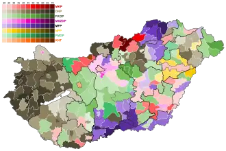 | Hungarian Independence Party | 670,751 | 13.43 | 47 | 2 | 49 | New | ||