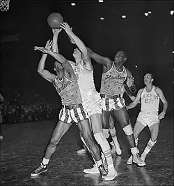 With only a few seconds left, Haynes flipped the ball to Ermer Robinson, who was stationed 30 feet from the basket. Flexing his knees and holding the ball to his chest, Robinson let fly the one-handed shot he had practiced hundreds of times a day on his childhood courts in San Diego. It was the same shot he had already missed three times in a row, and he hadn't sunk any from that far out. But this time the ball went in. Screaming fans poured onto the court. When the Globetrotters reached their locker room, they hoisted Saperstein, who was wearing double-breasted suit and wide tie, onto their shoulders.[1]
