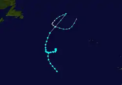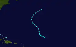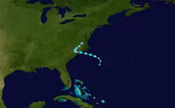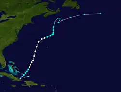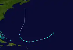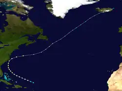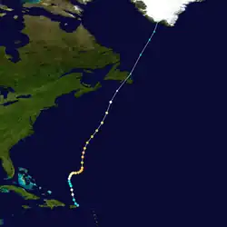 A tropical wave developed into a tropical storm east of Puerto Rico on September 3. It moved northward and strengthened to a hurricane later that day, but then weakened to a strong tropical storm the next day. At the same time, the system halted its forward motion and began to drift eastward. Early on September 5, it re-intensified into a hurricane, and it became a major hurricane on September 6. The storm turned to the north on September 7 and passed about 65 mi (105 km) east of Bermuda on September 8.[8][6] The hurricane weakened as it accelerated northeastward over cooler waters, and became extratropical on September 10 near Atlantic Canada. Shortly after becoming extratropical, it passed over Newfoundland, and ultimately dissipated on September 11 near southwestern Greenland.[8]