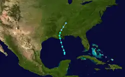 A tropical depression formed in the eastern Pacific Ocean just offshore Guatemala on September 27. The depression drifted northwestward and made landfall in Guatemala on September 28. It crossed southeastern Mexico and entered the Gulf of Mexico near Ciudad del Carmen on October 1. Shortly after entering the Gulf of Mexico, the system strengthened into a tropical storm and became a hurricane on October 2. It turned more to the north and intensified to a strong Category 2 hurricane on October 3. Subsequently, the storm made landfall near Freeport, Texas, on October 4 at the same intensity. The hurricane rapidly weakened to a tropical storm as it turned northeastward over land. On October 6, it weakened to a tropical depression over Missouri and later became extratropical. The storm accelerated northeastward and dissipated near Chicago.[6]
