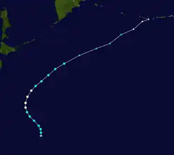 Kitty originated from an easterly wave that passed Kwajalein and intensified near 23 N and 154 E. It is believed that intensification was the result of a westerly trough that moved to the north of the storm prior to its detection. Further, the northwest movement into the nose of the Pacific high cell carried out in maintaining the gradient. Kitty began recurvature near 32 N and 140 E, but was never completed as the storm maintained a northerly movement across Honshu and dissipated near Hokkaido; reconnaissance reported a maximum wind of 65 knots. Kitty cut a wide swathe of destruction in the Tokyo area than any storm during the 1949 season; gusts of up to 75 knots were reported along with torrential rains.[11] Kitty is responsible for 135 deaths and 25 persons missing; it was one of the most destructive typhoons to hit Tokyo at that time.[12]