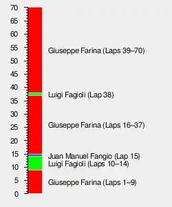 Nino Farina led for 63 laps (1–9, 16–37 and 39–70). Luigi Fagioli led for 6 laps (10–15). Juan Manuel Fangio led for 1 lap (38).