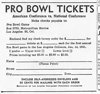 - ^ a b c d e "Pro Bowl Tilt Approved for Los Angeles," Los Angeles Times, June 4, 1950, part 2, pp. 9, 12.
