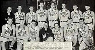 Unfortunately the Illini would lose 4 conference games during the Big Ten season which would give them a second-place finish. Three of the four losses came at the hands of ranked opponents. The starting lineup included captain Jim Bredar and Irving Bemoras at guard, Clive Follmer and Max Hooper at the forward slot with Robert Peterson and, future hall of famer Johnny "Red" Kerr at the center position. The team also included former University of Minnesota head coach Jim Dutcher.[1]