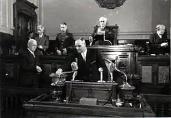 ![]() Workers' Party First Secretary and Prime Minister Gheorghe Gheorghiu-Dej (at microphones) and head of state Petru Groza (at left) cast their ballots in favour of the Constitution. | |