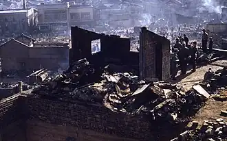 The city government organized relief efforts, and relocated displaced people elsewhere. The government also worked on constructing more permanent housing and demolishing other shanty towns.[1] United Nations Command soldiers in the city, under general Richard S. Whitcomb, distributed their own supplies for the refugees, and ended up assisting 23,100 people. Its engineers worked to clear the burned remains and construct temporary facilities for the displaced people.[2][3] Whitcomb ordered the distribution in violation of U.S. military law; for this he was summoned to the U.S.[3]