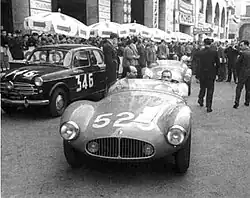 The works S. P. A. Alfa Romeo entered in force with three new cars, the Alfa Romeo 6C 3000 Competizione Maggiorata to be driven by Fangio, Karl Kling, and Consalvo Sanesi. Scuderia Lancia had assembled a veteran team, consisting of Piero Taruffi, four-time winner Clemente Biondetti, Umberto Maglioli, Felice Bonetto and Franco Bornigia with the first four driving their D20 2900. Ferrari for their part arrived with four 300 bhp 4.1 litre, Ferrari 340 MM Spyder Vignale for Luigi Villoresi, Giuseppe Farina, Giannino Marzotto and the American racer Tom Cole. For 1953, the Mille Miglia was a round of the new World Sports Car Championship, the home teams faced strong challengers. From Great Britain, came Aston Martin and Jaguar, and France sent Gordini.[2][3]