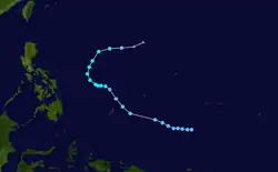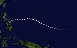 Irma formed on February 18, just near the International Date Line. The storm moved west over the following days, slowly increasing its speed before reaching its peak intensity on February 23. The storm quickly lost speed, then made landfall over the Visayas archipelago of the Philippines. On December 25, the storm dissipated just near the province of Iloilo.[1]