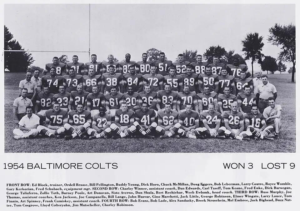 The 1954Baltimore Colts season was the second season for the team in the National Football League. The Baltimore Colts finished the National Football League's 1954 season with a record of 3 wins and 9 losses and finished sixth in the Western Conference. This was the first season that the Horseshoes appeared on the helmet. For the first two seasons (1954 & 55), the horseshoes were white and they were located on the back of an all blue helmet. In 1956 the color of the helmet change to White while the Horseshoes became blue. It wasn't until 1957 when the Colts received their most famous helmet design that's still in use to this day, a white helmet with a blue stripe down the middle and a blue horseshoe on either side.